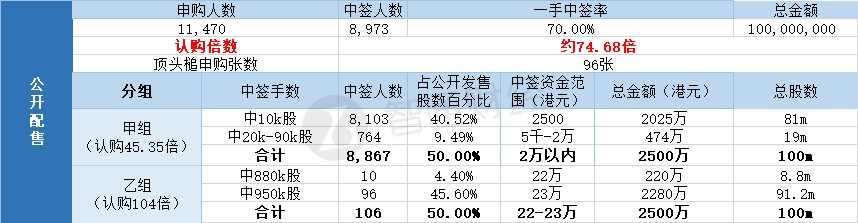 其中,公开配售中签人数8973名,一手中签率70%,认购倍数约74.68倍。