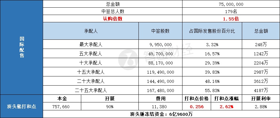 国际配售中签人数179名,认购倍数约1.55倍。