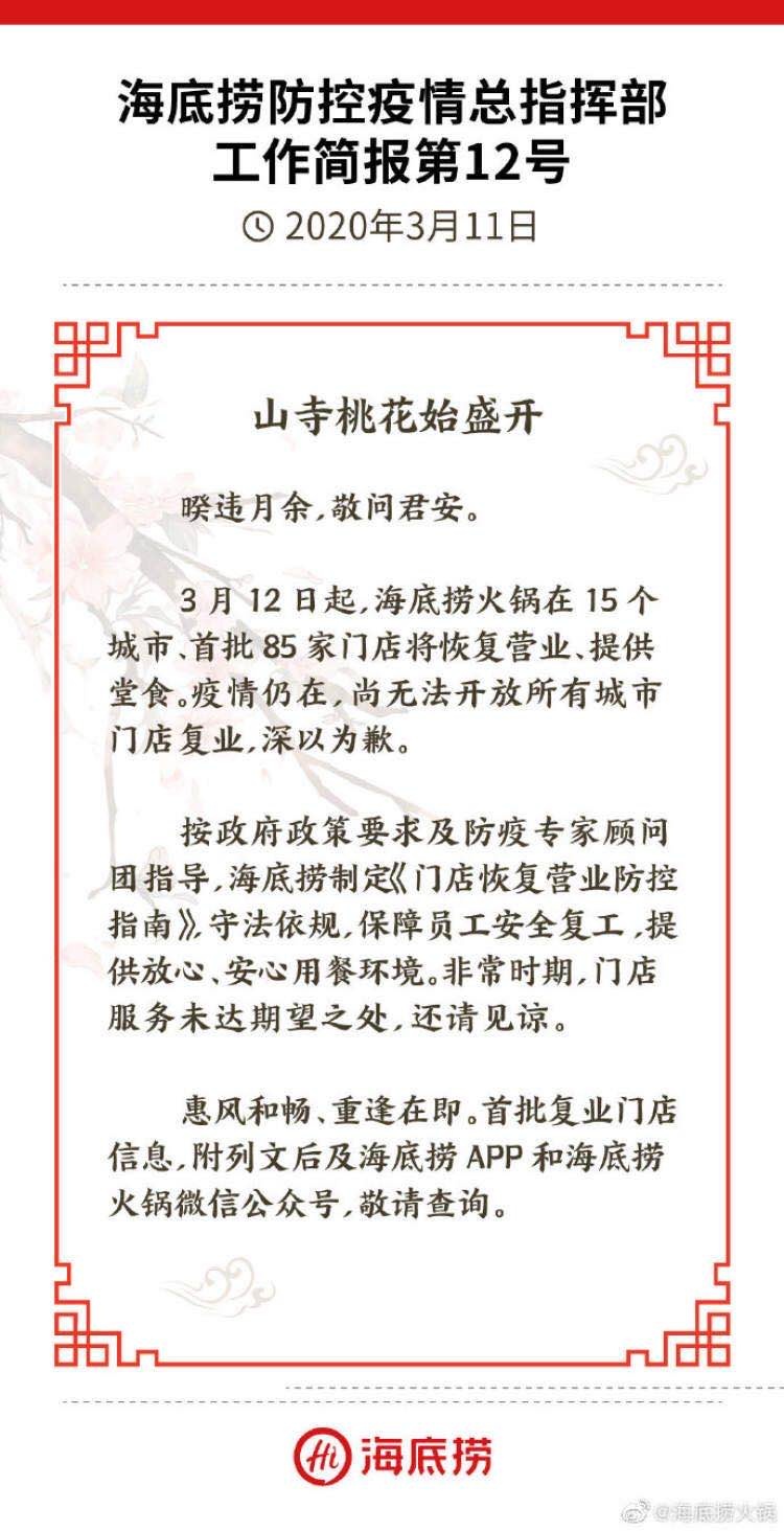 对于此次恢复堂食,海底捞方面称,尚处疫情仍在防控期间,无法开放所有城市门店复业,此次首批恢复堂食的门店涉及成都、杭州、南京等15个城市,北上广深尚未恢复。