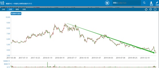 智通财经APP了解到,从中国光大国际(00257)分拆上市的生物质发电巨头中国光大绿色环保,于2017年5月上市起经历长达一年上行之后变出现了180度的反转,公司股价自2018年5月创出8.75港元历史最高点位之后一路下行。长时间股价调整并未让光大绿色环保积蓄上行的动能,公司于2020年2月初只是跟随大盘企稳走出一波小幅反弹后,便在2月26日全年业绩发布之后再度进入放量急跌态势,业绩发布后的3个交易日累计跌幅达18%,之后的3月9日更是打出了3.42港元历史新低,较历史高位的跌幅已逼近60%。