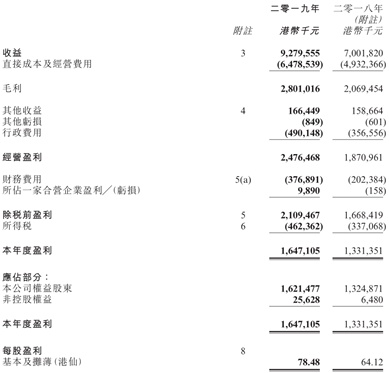 但是在费用方面,行政开支、财务费用、所得税均分别同比大幅增长37.5%、86.2%、37.2%,至4.9亿元、3.77亿元、4.62亿元,使得公司税后净利润仅剩16.47亿元,同比增幅缩窄至23.7%,扣除非控股权持有人部分后的股东应占利润为16.21亿元,同比增幅为22.4%。