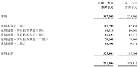 对应的流动资产端,应收账款相关项、合约资产和现金及现金等价物三项是主要组成部分。其中2019年末现金及现金等价物同比增长31.3%至26.85亿元并无太大问题。而共计13.8亿元的即期应收账款、其他应收款项、按金及预付款项中,公司给出账龄的7.11亿元应收账款部分,逾期部分就达到了3.24亿元。而且逾期越久的账款增速越快,其中逾期一月内的账款与去年同期持平,但是逾期1-3月、3-6月、6-12月和超12月的应收账款,分别同比增长58.6%、244.8%、734.9%和518%。