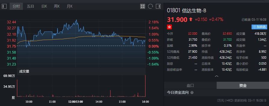 截至今日收盘,信达生物-B(01801)涨0.47%,报31.9港元。