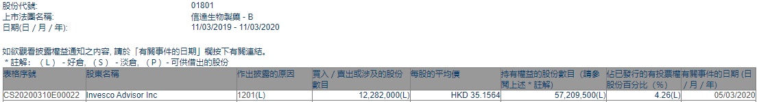 智通财经APP获悉,联交所最新资料显示,3月5日,Invesco Advisor Inc减持信达生物-B(01801)1228.2万股,每股作价35.16港元,总金额约为4.32亿港元,减持后持股数目约为5721万股,持股比例为4.26%。