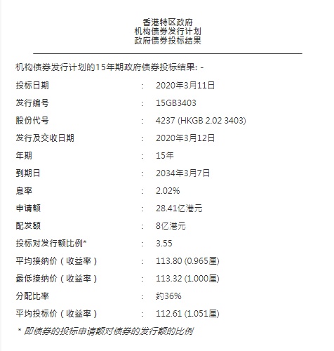 此次发行总值8亿港元的15年期政府债券,债券的投标申请总额达28.41亿港元。投标对发行额比例(即债券的投标申请总额对债券的发行总额的比例)为3.55。平均接纳价是113.80,即以年率计的收益率为0.965厘。