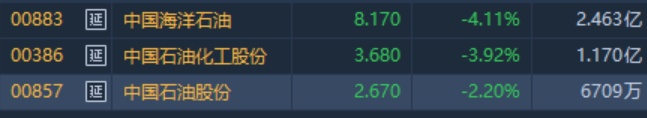智通财经APP获悉,国际油价全线下跌,布油收跌3.71%报35.84美元/桶。截至9时39分,中海油(00883)跌4.11%,报价8.17港元,中石化(00386)跌3.92%,中石油(00857)跌2.2%。
