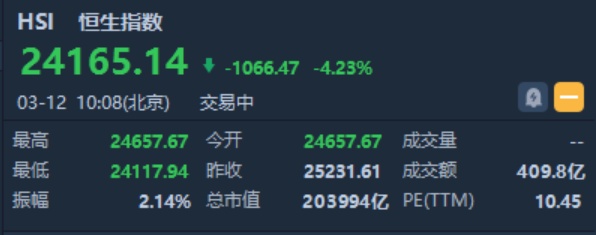 智通财经APP获悉,恒生指数早盘跌幅持续扩大,挫逾千点一度低见24117.94点,创2017年4月25日以来新低。截至10时08分,恒指跌1066.47点或4.23%,报24165.14点,成交额暂为409.8亿。