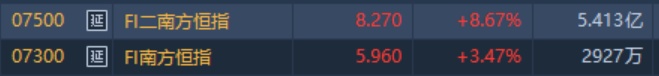 恒指反向杠杆产品逆市获捧,截至发稿,FI二南方恒指(07500)涨8.67%,报8.27港元,成交额达5.413亿。FI南方恒指(07300)涨3.47%。