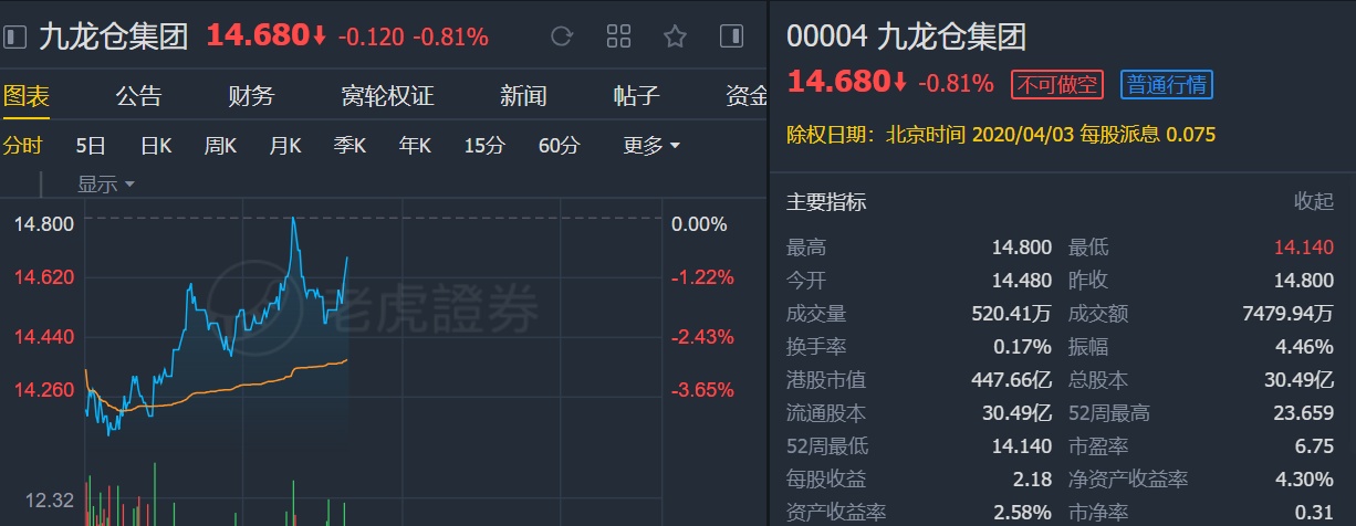 基于入住率下降以及旅游人次减少,该行将公司2020及2021财年的酒店业务的息税前利润预测分别下调24%及7%。整体而言,对九仓2020及2021财年的每股盈利预测分别调低12%及9%,每股派息的预期也有所下调,因为公司预期往后的派息比率为30%。该行表示,在基本的情境下,目标价由原来的21.5港元下调至20港元,予“增持”评级,认为其估值便宜,较资产净值折让逾60%。