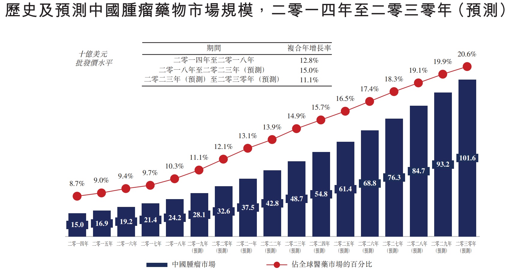 4、诺诚健华主要研究方向是抗肿瘤及自身免疫性疾病的药物,受益于人口老龄化和癌症发病率增长、对癌症认知的提以及癌症治疗模式由化疗转向分子靶向疗法及肿瘤免疫治疗所推动。中国的小分子靶向肿瘤药物市场规模于2018年达到18亿美元,并预期于2023年将达到42亿美元,及于2030年进一步达到103亿美元。很宽的赛道,不过增速就有点一般。7分