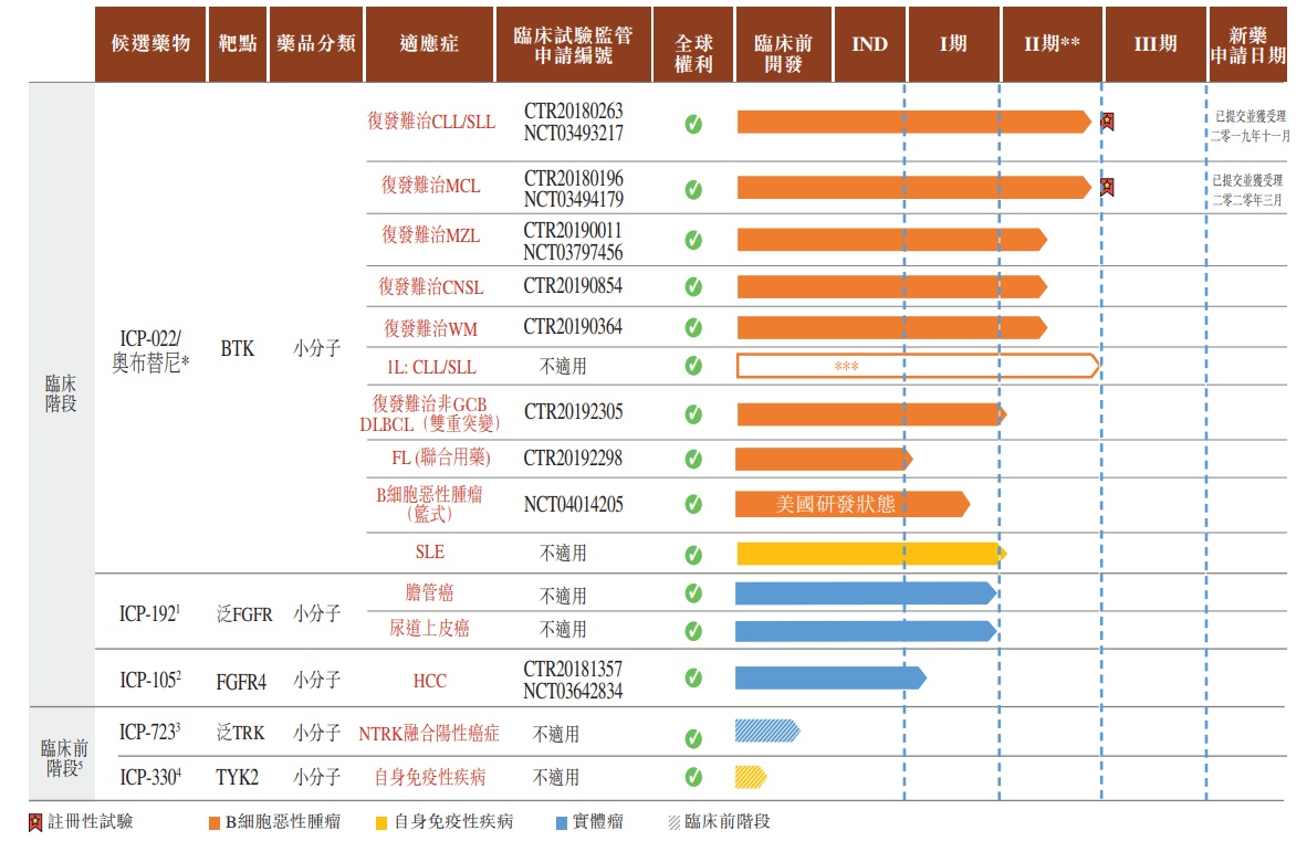 在不到四年的时间内,诺诚健华团队发现并研发了九种候选药物,包括一种复发难治CLL/SLL的及MCL适应症的新药申请已提交予NMPA并获受理的候选药物、两种处于I/II期临床试验的候选药物及六种处于IND准备阶段的候选药物。