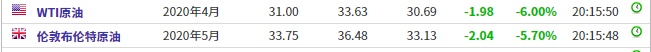 截至发稿,WTI原油跌6.00%,报31.00美元/桶。布伦特原油跌5.70%,报33.75美元/桶。