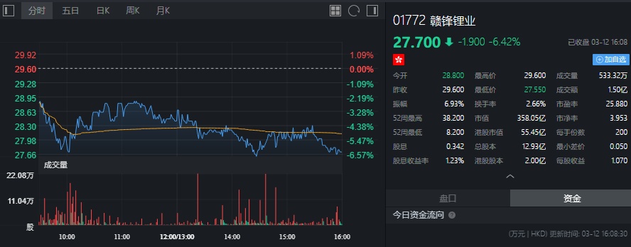 截至今日收盘,赣锋锂业跌6.42%,报27.70港元。