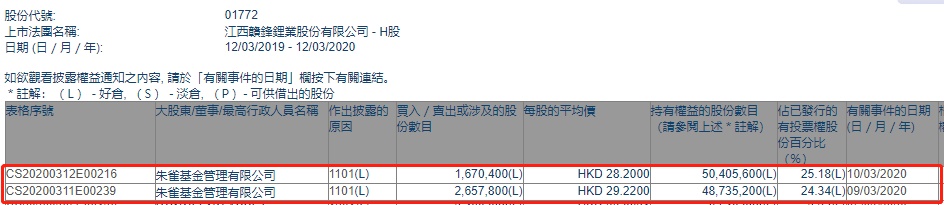 智通财经APP获悉,联交所最新资料显示,3月9和10日,朱雀基金分别增持赣锋锂业(01772)265.78万股和167.04万股,合计432.82万股,每股分别作价29.22港元和28.20港元,总金额约为1.25亿港元,增持后持股数目为5040.56万股,持股比例为25.18%。
