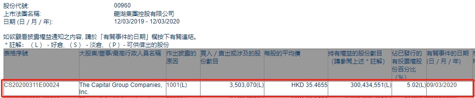智通财经APP获悉,联交所最新资料显示,3月9日,美国资本集团增持龙湖地产(00960)350.3070万股,每股作价35.4655港元,总金额约为1.24亿港元,增持后持股数目为3亿股,持股比例为5.02%。