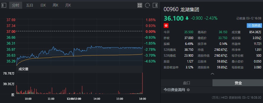 截至今日收盘,龙湖地产跌2.43%,报36.10港元。