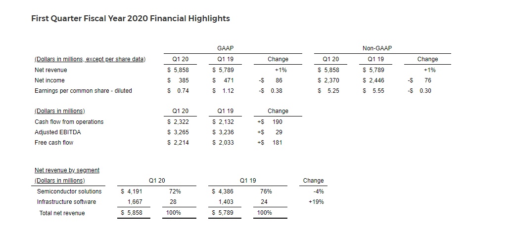 智通财经APP获悉,3月12日美股盘后,全球领先的有线和无线通信半导体公司博通(AVGO.US)公布了截止至2月2日的2020财年第一季度业绩。