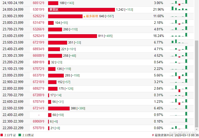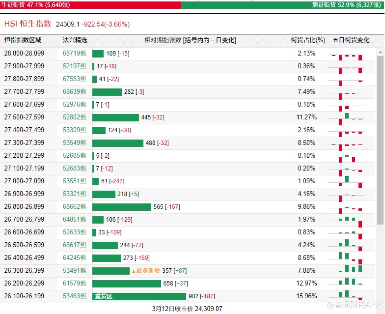 智通财经APP获悉,截至3月13日,恒指最新的牛熊街货比例47.1:52.9。法兴恒指牛熊证街货分布图中的数据显示,熊证街货重货区在26100-26199区间,该区间最新熊证数量为902张,较上一交易日减少187张,最多新增区间在26300-26399之间,新增熊证87张。牛证街货重货区在24000-24099区间,该区间最新牛证数量为1242张,较上一交易日增加153张,最多新增区间也在在23900-23999之间,新增牛证587张。