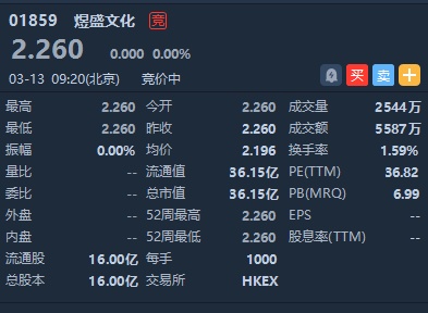 智通财经APP获悉,煜盛文化(01859)首日挂牌,公告显示,公司发行4亿股,每股定价2.26港元,每手1000股,所得款项净额约8.3亿港元。截至发稿,平开,报2.26港元,成交额5587.2万港元。