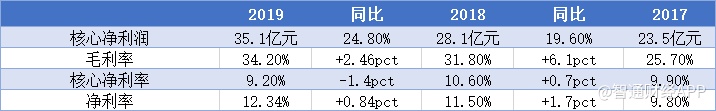 盈利表现方面,公司于2019年实现核心净利润35.1亿元,同比增长24.8%,较去年同期进一步增速。毛利率增长2.46个百分点至34.2%,核心净利率下降1.4个百分点至9.2%。而从净利率来看,公司2019年净利率则同比上升0.84个百分点至12.34%。