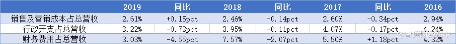 行政开支、财务费用占总营收比重分别同比减少0.73、4.55个百分点。其中,公司财务费用占营收比重于2019年出现较大幅度减少,低于2016年水平。