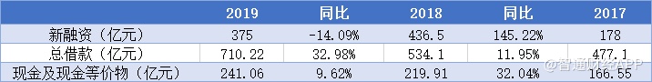融资方面,公司2019年新融资375亿元,规模较去年减少14.09%;总借款则较2018年增加32.98%至710.22亿元人民币。截至2019年公司手握现金及现金等价物241.1亿元,同比增长9.62%。