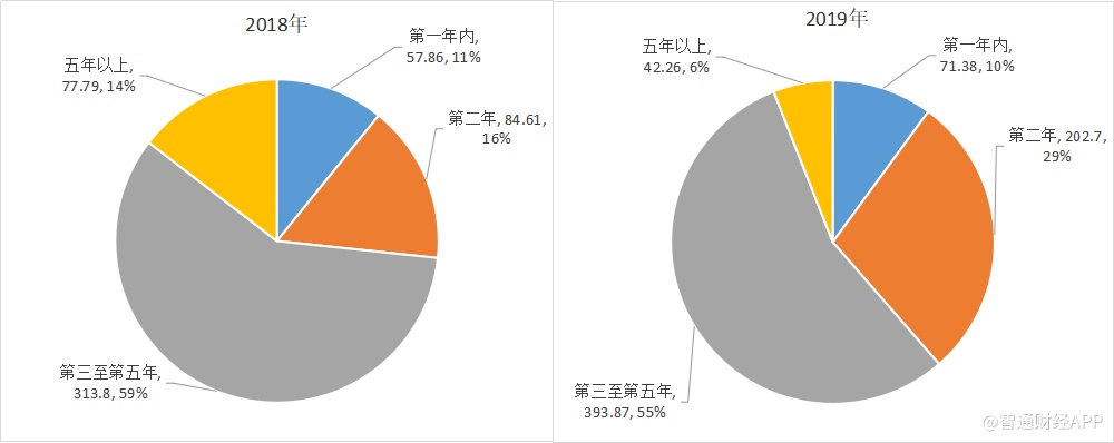 具体来看,公司2019年新增借款主要集中在中期借款。从借款账龄结构来看,公司三至五年、五年以上的长期借款比重分别减少4个百分点、8个百分点,一年内借款也减少1百分点。2019年唯一增长的则为两年账龄借款,较去年同期大幅增长9%。