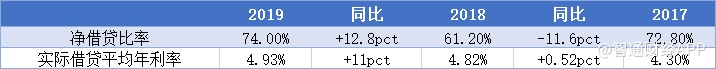 2019年,公司净借贷比率达74%,同比增长12.8个百分点。对此,公司投资者关系部总经理表示,净借贷比率上升主要与公司规模扩大、总借贷规模增加有关,74%仍为行业内较低水平。