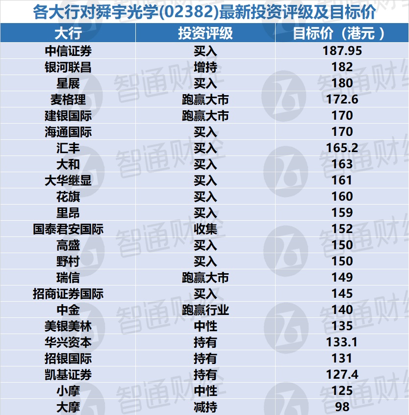 以下列出23家券商对舜宇光学最新投资评级及目标价: