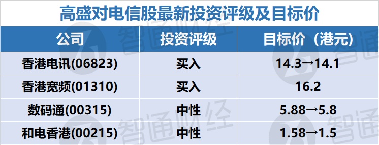 该行下调香港电讯(06823)今年的收入、除息税折旧及摊销前利润(EBITDA)及每股盈利预测2.6%、2%及4.3%,以反映漫游、企业业务及手机销售收入下降;下调香港宽频(01310)今年的收入、EBITDA及每股盈利预测2.2%、2%及7.3%,以反映企业业务及MVNO(虚拟网络供应商)收入下降;下调数码通(00315)今年的收入、EBITDA及每股盈利预测8.8%、5.1%及12.3%,以反映漫游、企业数码项目收入及手机销售下降;下调和电香港(00215)今年的收入、EBITDA及每股盈利预测7.8%、5%及12.5%,以反映漫游及手机销售下降。
