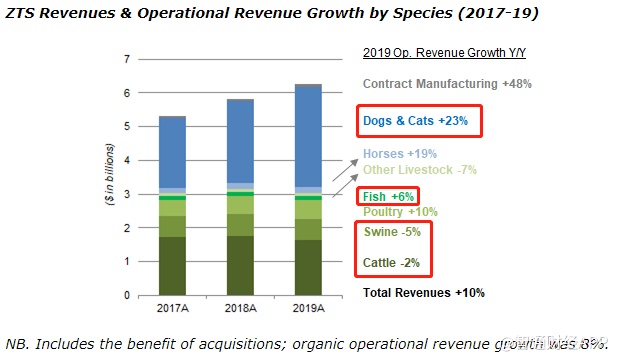 从品种来看,Zoetis的收入增长是由来自狗和猫的23%的收入增长带动的。在畜牧业方面,猪的收入下降了5%,牛的收入下降了2%,由于上述原因,两者都反映出市场疲软,但家禽收入上升了10%,鱼类收入上升了6%。