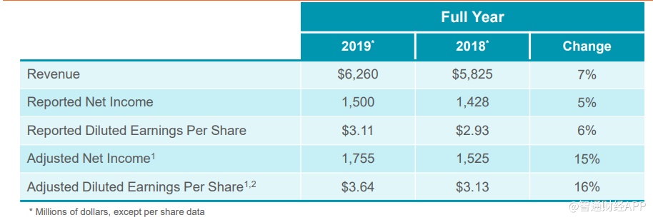 全年来看,公司2019财年营收同比增长7.5%至62.6亿美元;调整后EBIT同比增长13.9%;调整后净利润同比增长15.1%;EPS同比增长16.2%。