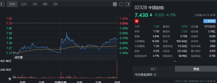 截至今日收盘,中国财险跌4.13%,报7.43港元。