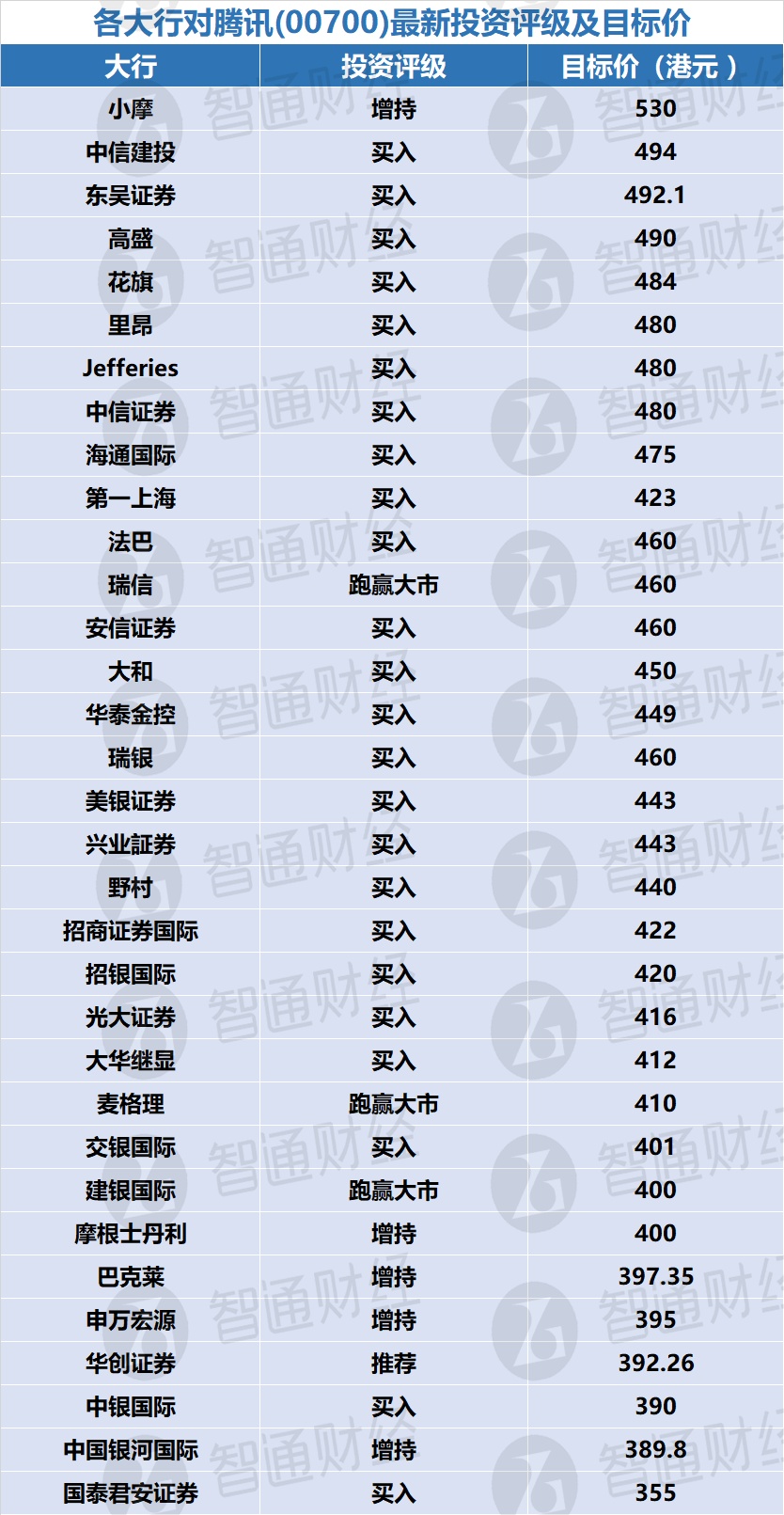 五、各大行对腾讯(00700)最新投资评级及目标价