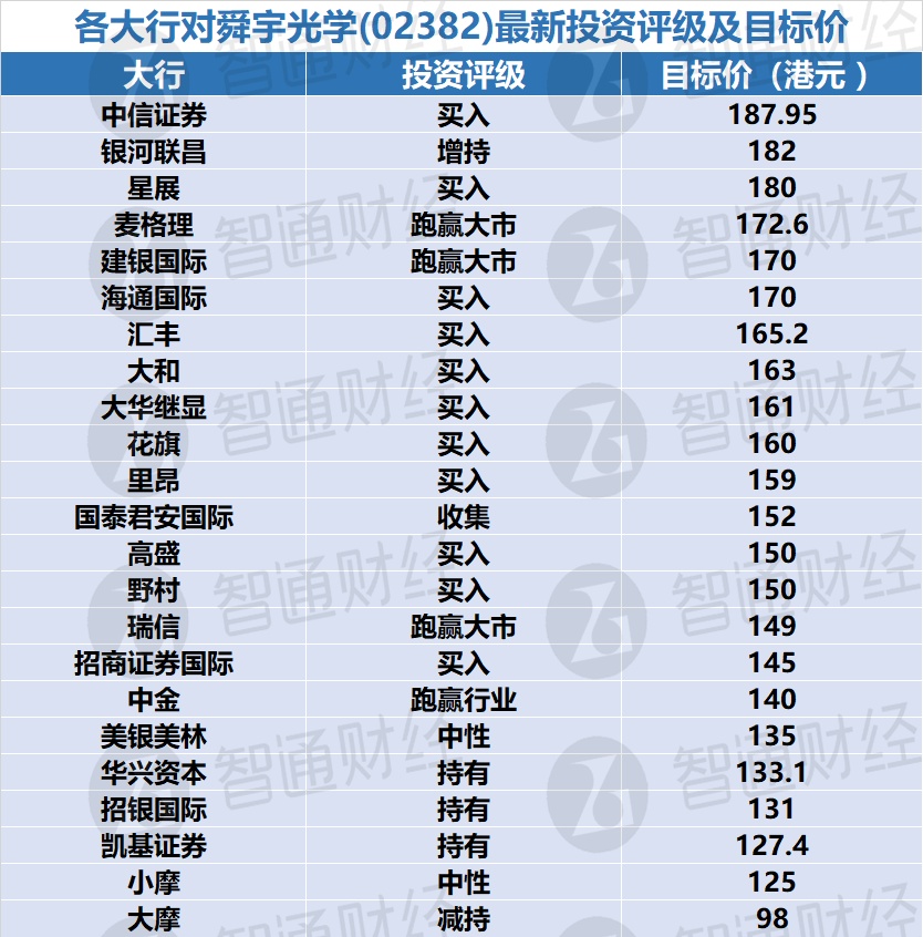 十、各大行对舜宇光学(02382)最新投资评级及目标价