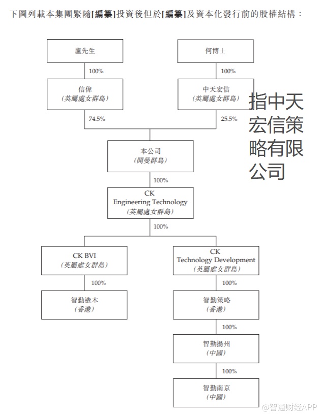 资料显示,中天宏信策略在上市前的重组中投资智勤控股。2018年10月,中天宏信策略与智勤控股及信伟订立协议,中天宏信策略通过认购及受让的方式获得智勤控股2550股股份,总代价为5100万港元,每股均价2万港元。重组后,信伟及中天宏信策略分别持有智勤控股74.5%、25.5%的已发行股本。