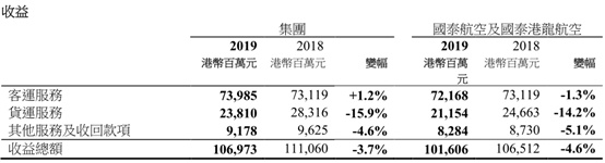 作为第二大业务的货运服务,在国际贸易问题影响下全年货运需求显著低于2018年,集团共计货运收入同比大幅下滑15.9%至238.1亿元;再加上其他服务及收回款项还有4.6%的同比下滑,国泰航空集团营收总额为1069.73亿元,同比降幅为3.7%。