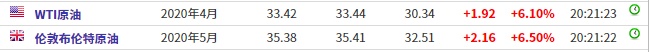 截至发稿,WTI原油涨6.10%,报33.42美元/桶。布伦特原油涨6.50%,报35.38美元/桶。
