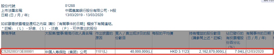 智通财经APP获悉,联交所最新资料显示,3月12日,中国人寿保险(集团)公司增持农业银行(01288)4000万股,每股作价3.1123港元,总金额约为1.24亿港元,增持后持股数目为21.63亿股,持股比例为7.04%。