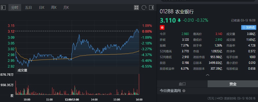 截至今日收盘,农业银行跌0.32%,报3.11港元。