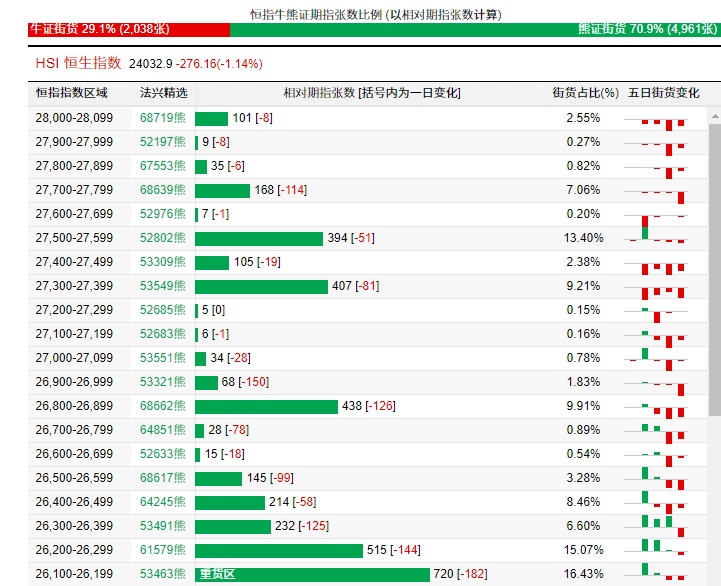 智通财经APP获悉,截至3月14日,恒指最新的牛熊街货比例29.1:70.9。法兴恒指牛熊证街货分布图中的数据显示,熊证街货重货区在26100-26199区间,该区间最新熊证数量为720张,较上一交易日减少182张。牛证街货重货区在22500-22599区间,该区间最新牛证数量为550张,较上一交易日增加152张,最多新增区间也在在21800-21899之间,新增牛证355张。