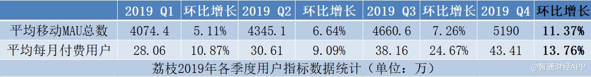 事实上,若从业绩的角度来看,荔枝的表现并不算差。用户运营指标方面,荔枝在2019年第四季度的平均移动MAU总数为5190万,环比增长11.37%,平均每月付费用户为43.41万,环比增长13.76%。