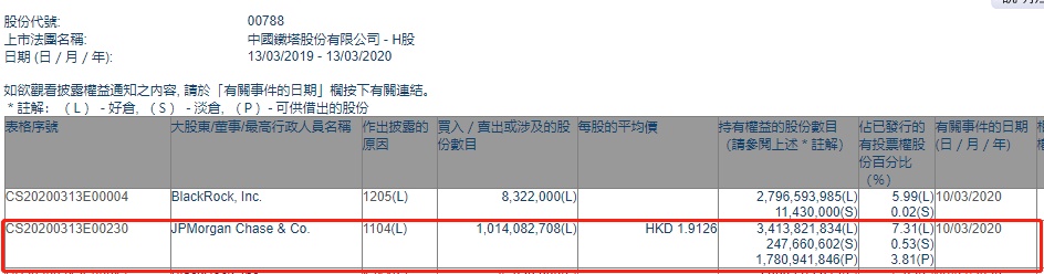 智通财经APP获悉,联交所最新资料显示,3月10日,摩根大通增持中国铁塔(00788)10.14082708亿股,每股作价1.9126港元,总金额约为19.40亿港元,增持后持股数目为34.14亿股,持股比例为7.31%。