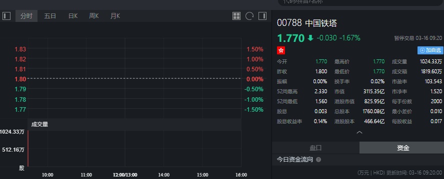 今日盘前交易时段,截至发稿,中国铁塔跌1.67%,报1.77港元。