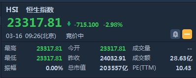智通财经APP获悉,恒生指数开盘跌715.1点或2.98%,报23317.81点,国企指数跌2.88%,报9372.17点,红筹指数跌2.91%,报3542.36点。大市盘前成交28.64亿港元。