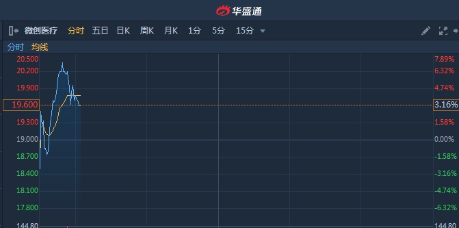 智通财经APP获悉,微创医疗(00853)早盘一度涨超7%,高见20.4港元,创历史新高,截止发稿,微创医疗(00853)涨4.53%,报19.68港元,成交额2.99亿。