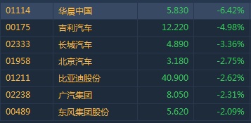 截至11时29分,华晨中国跌6.42%,报价5.83港元,长城汽车(02333)跌3.36%,广汽集团(02238)跌2.31%。