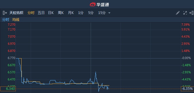 智通财经APP获悉,天虹纺织(02678)午间发布年度业绩,股东应占溢利同比下降24%至8.8亿人民币,末期息每股0.15港元,不及市场预期。截至13时36分,跌6.35%,报价6.34港元,成交额399.6万。