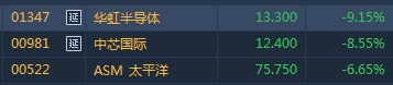 智通财经APP获悉,半导体板块午后随A股跌幅扩大,华虹半导体(01347)挫逾9%,暂领跌板块,截至13时55分,华虹半导体跌9.15%,报价13.3港元,中芯国际(00981)跌8.55%,ASM太平洋(00522)跌6.65%。