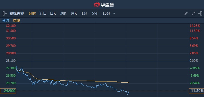 智通财经APP获悉,赣锋锂业(01772)午后A股跌停,H股重挫逾12%,跌破60日均线。截至14时06分,跌12.46%,报价24.6港元,成交额1.865亿。